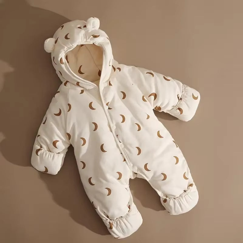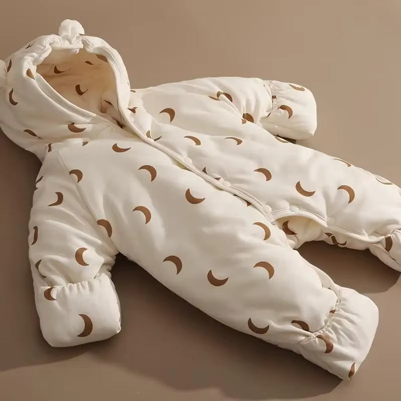 Håll din bebis trygg och varm med denna vinteroverall som kombinerar komfort och stil. Den mjuka bomullsfyllningen och det charmiga måntrycket gör plagget perfekt för kalla dagar, samtidigt som den ger ditt barn en söt look. Med praktiska dragkedjor och en huva med små öron är overallen enkel att ta på och av, vilket underlättar för både promenader och hemmamys.